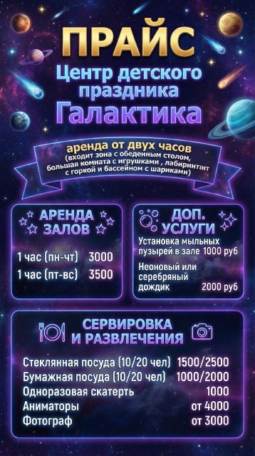 У нас множество развлечений, просторные и яркие комнаты размером 170 кв. метров для Вашего праздника.