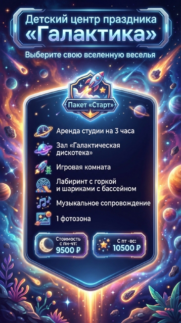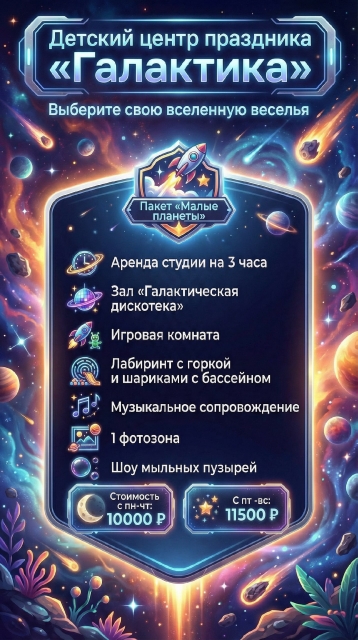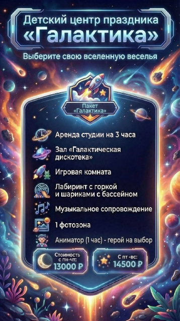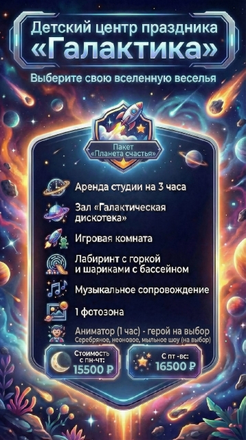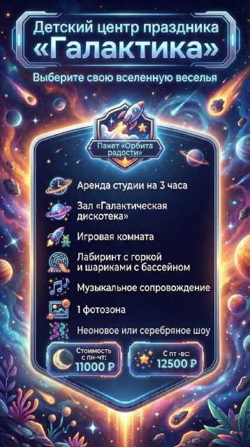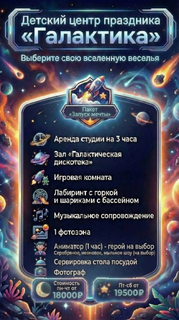 У нас множество развлечений, просторные и яркие комнаты размером 170 кв. метров для Вашего праздника.
