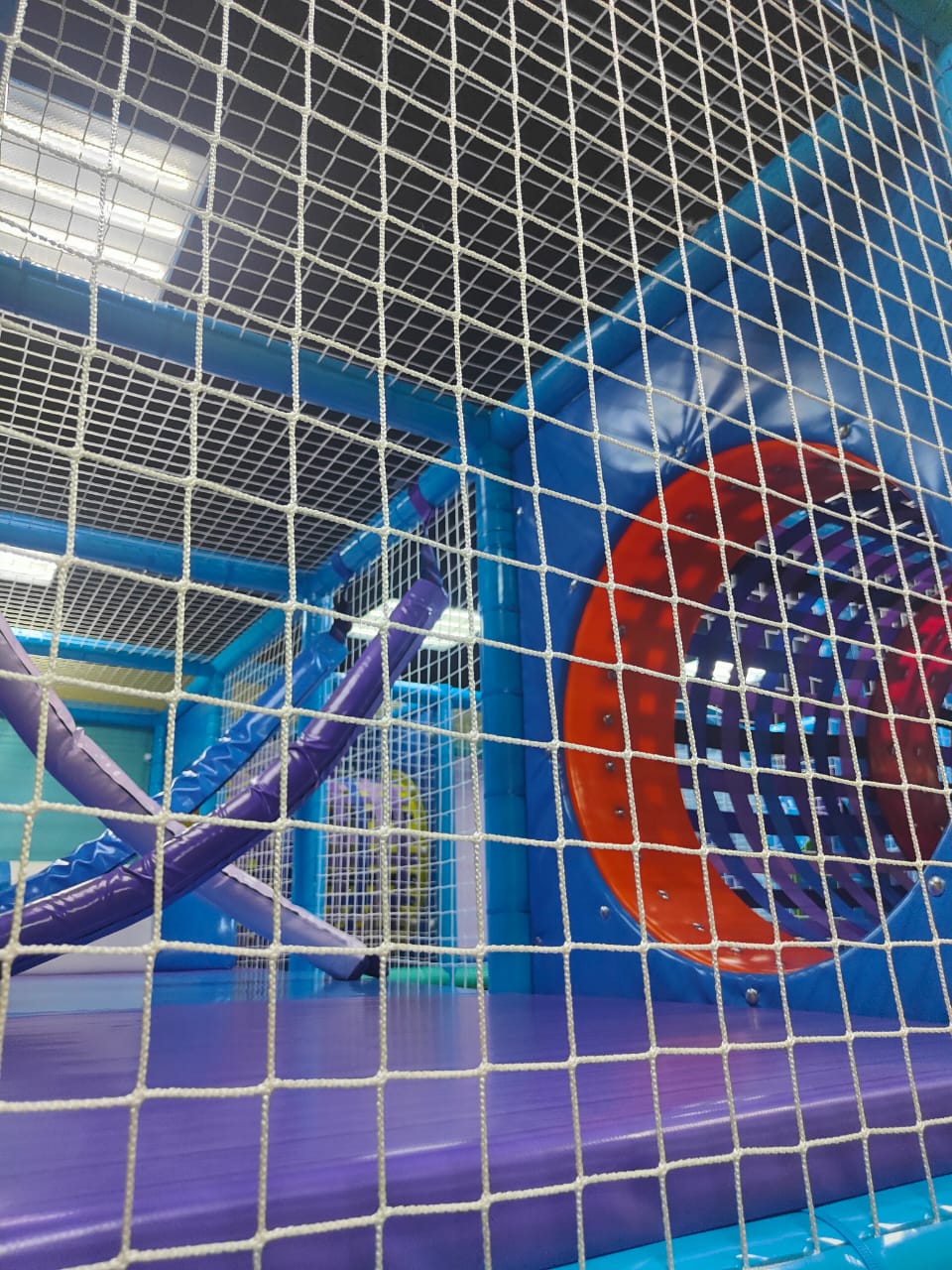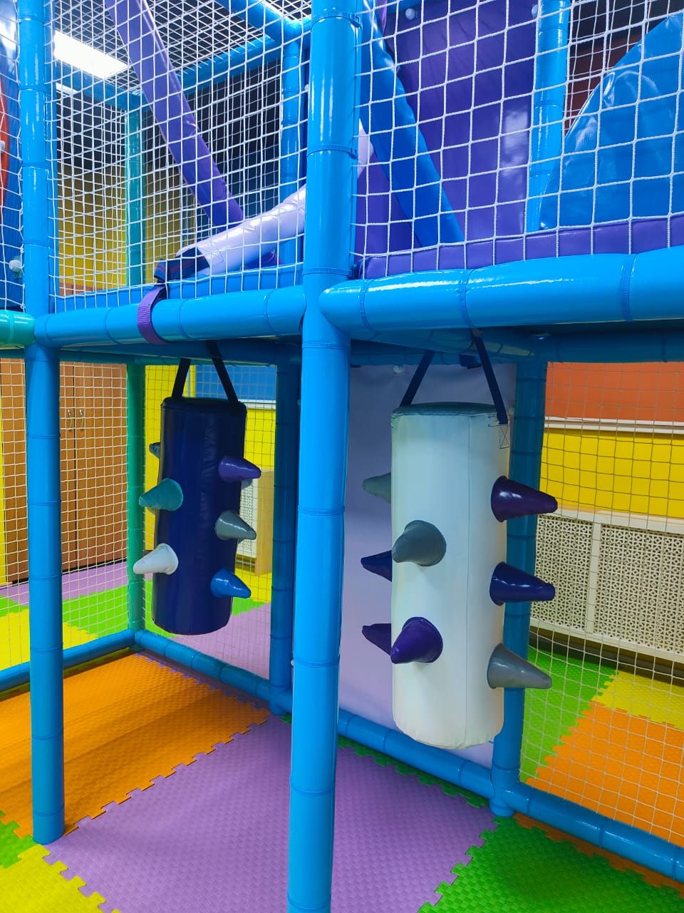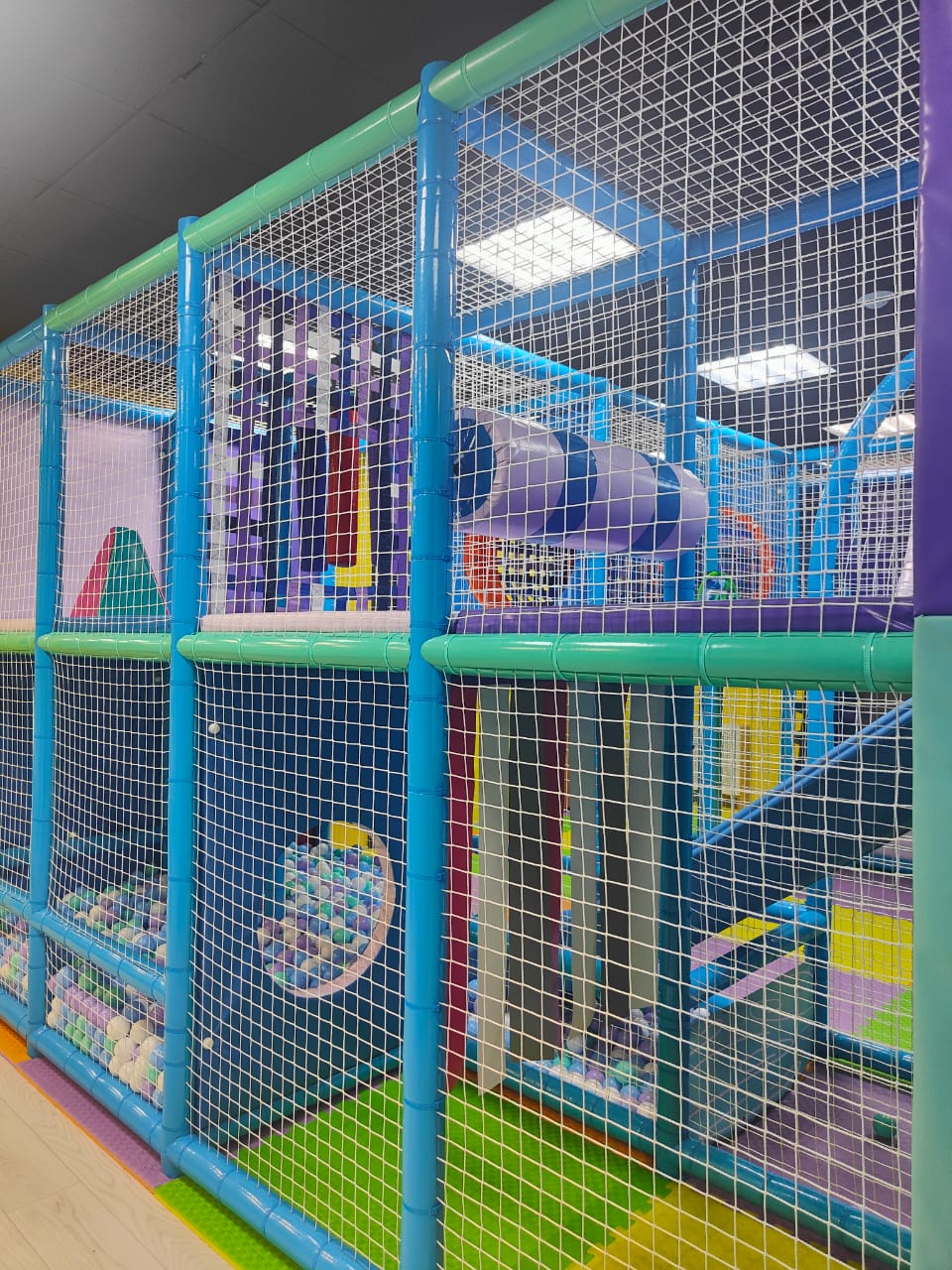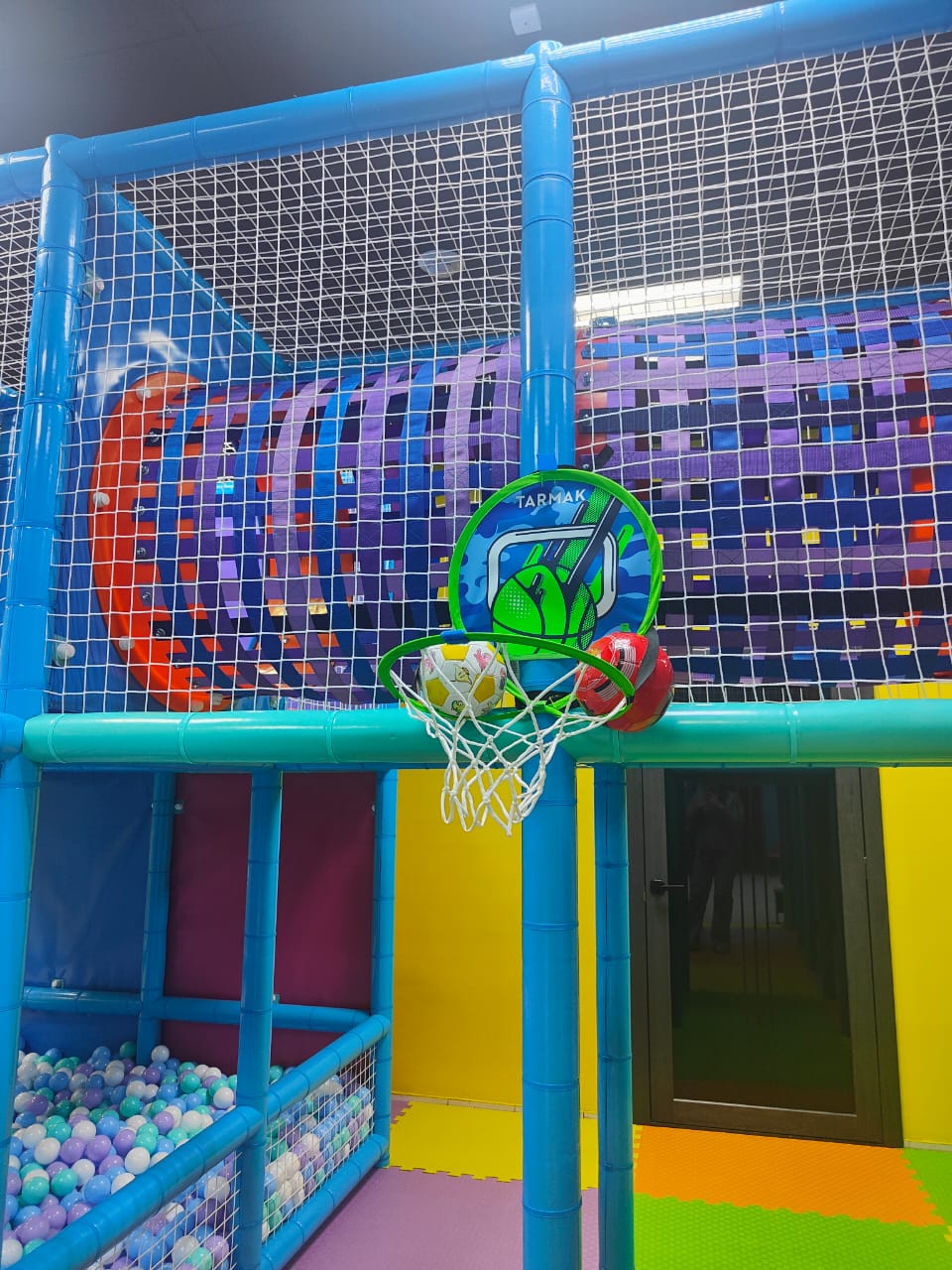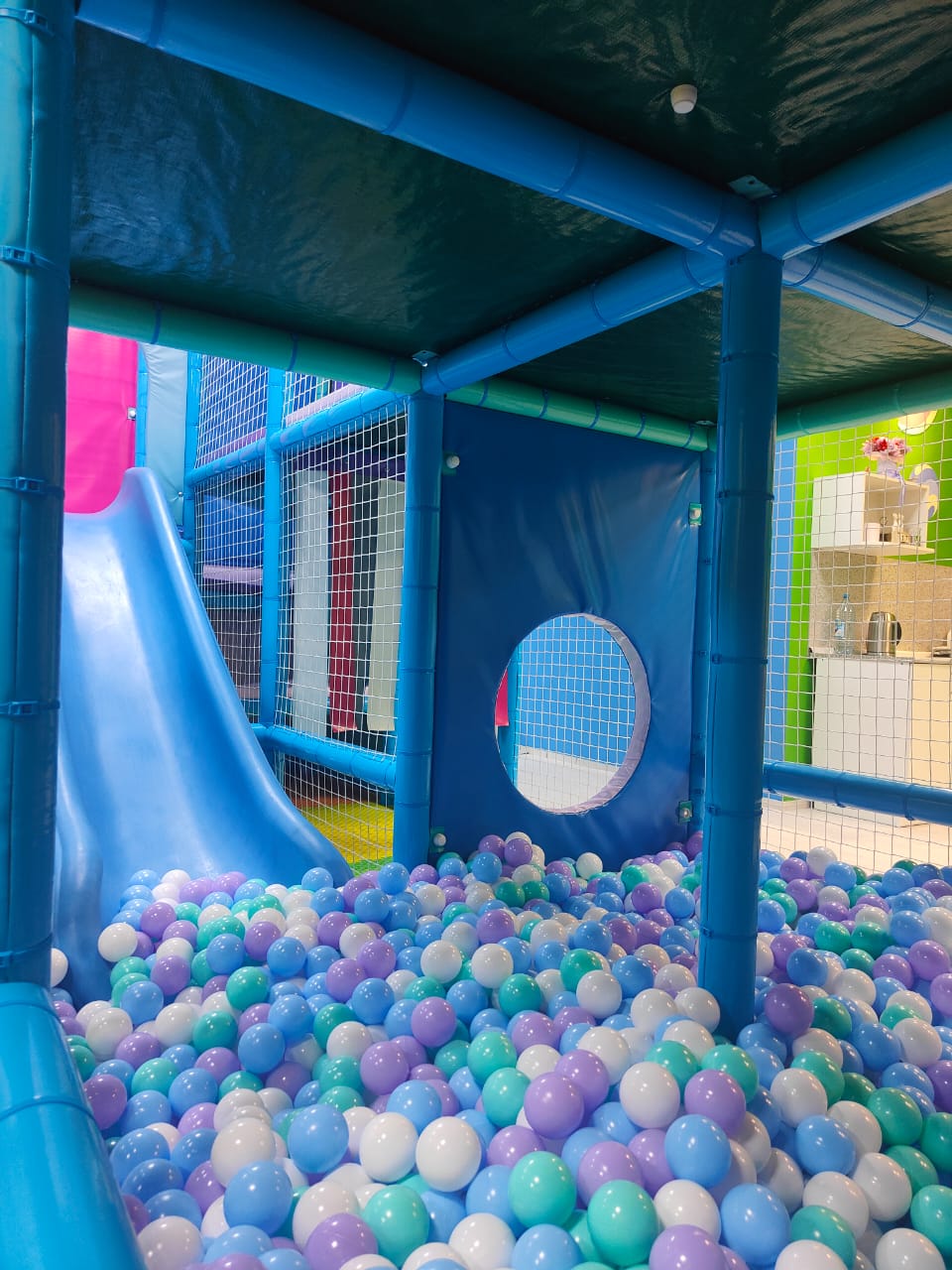 Детский лабиринт с полосой препятствий, горкой и бассейном с шариками.